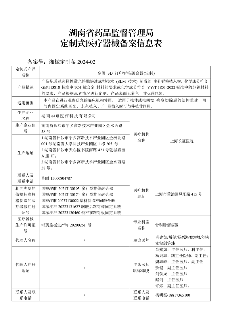 定制式博天堂娱乐备案信息表(湘械定制备2024-02)
